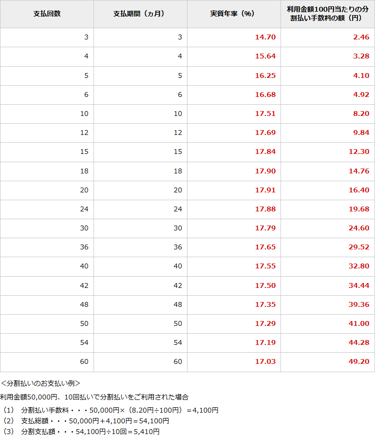 <分割払いの返済方法・回数・手数料率など>